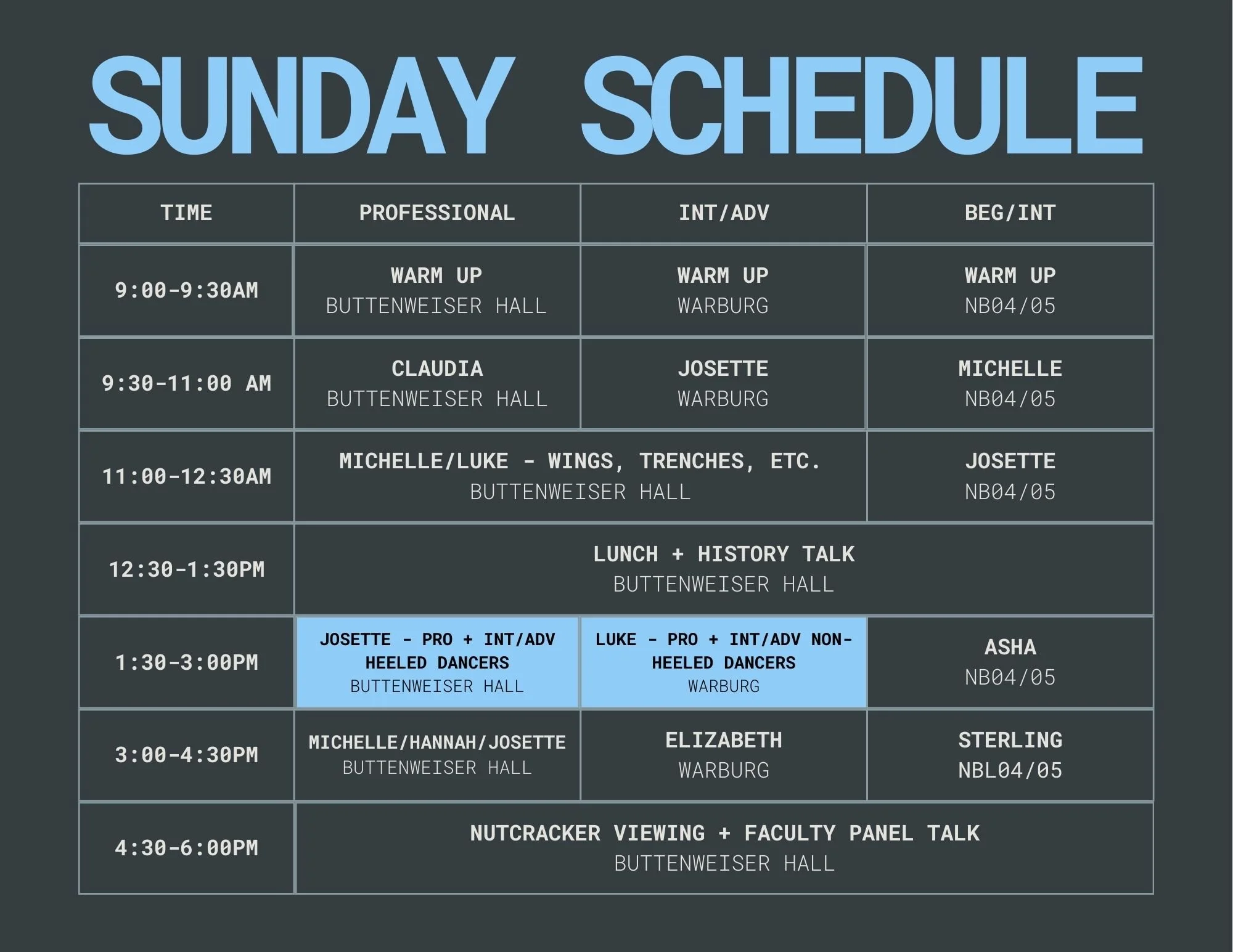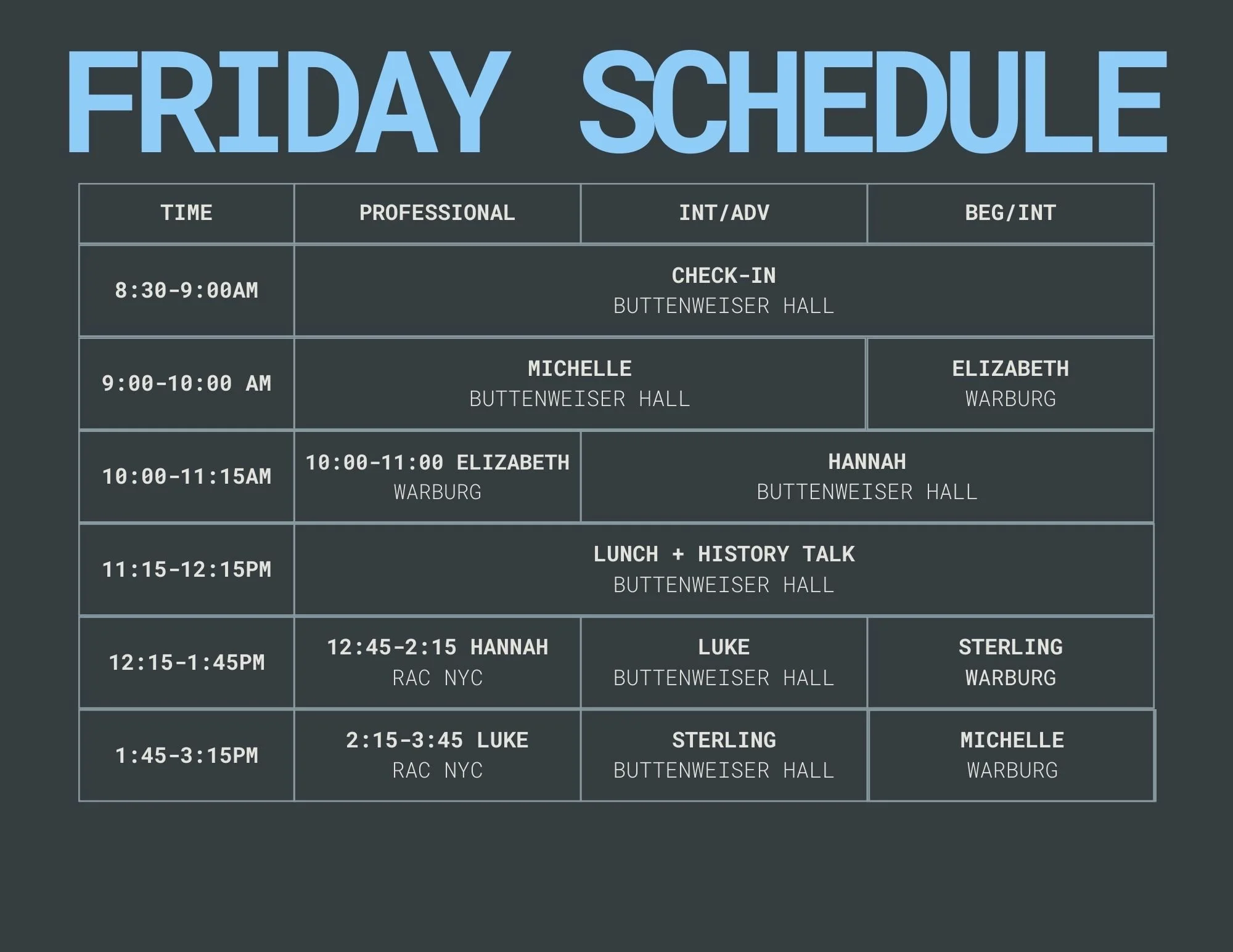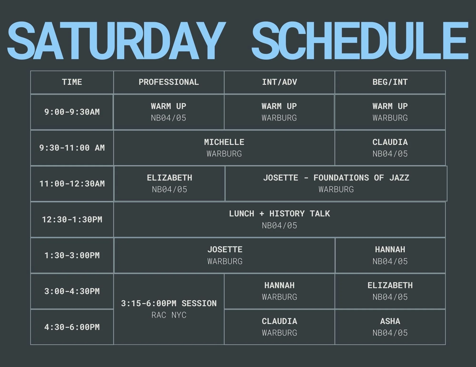 All classes for the Beginner/Intermediate and Intermediate/Advanced tracks will be held in studios at The 92NY (Buttenweiser Hall, Warburg, or NLL04/05). Some classes for the Professional track will be held at Rhythmic Arts Center NYC (16 minutes walk from 92NY). Please refer to the schedule for class locations.